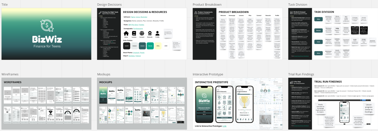 For the final phase of the sprint, my team and I worked together on a report. Katie, Olivia and myself broke up the writing sections and gathering materials while Neha was our designer. The report explains the steps we took, our thinking and our methods while creating BizWiz.