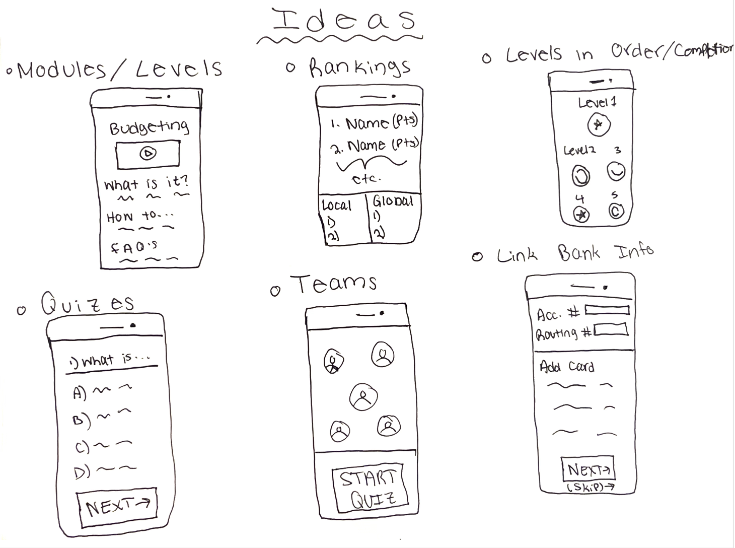 After asking these questions and trying to visualize the ideas, we ultimately pursued an app as it better targets the audience demographics due to accessibility and features a website, game, or social media brand wouldn’t have — such as push notifications. We then each thought of names and after sharing ideas, we agreed on ‘BizWiz.’