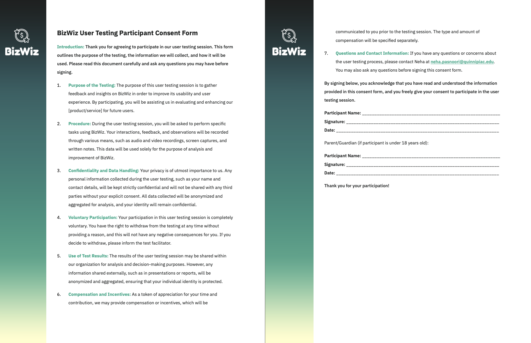 After each team member found an interviewee, we first had them fill out a consent form. We made sure the consent form matched the BizWiz brand.