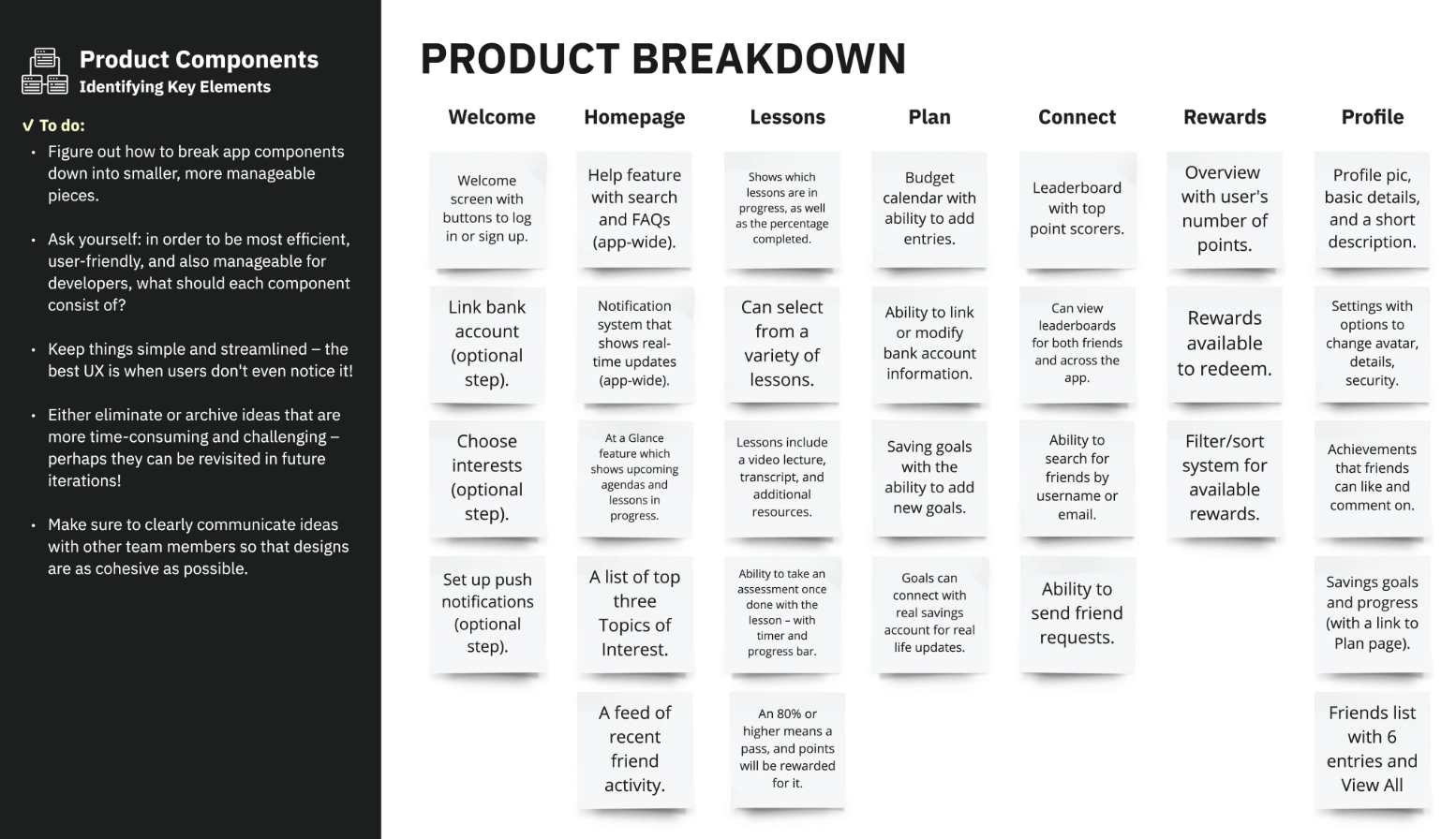 To begin our prototype for phase three of the sprint, the group met to plan the product breakdown. As a group, we decided to lay out each section/page of the app: Welcome, Homepage, Lessons, Plan, Connect, Rewards and Profile. From there, we added important features for each page. This helped the team know what would be needed in the prototype.