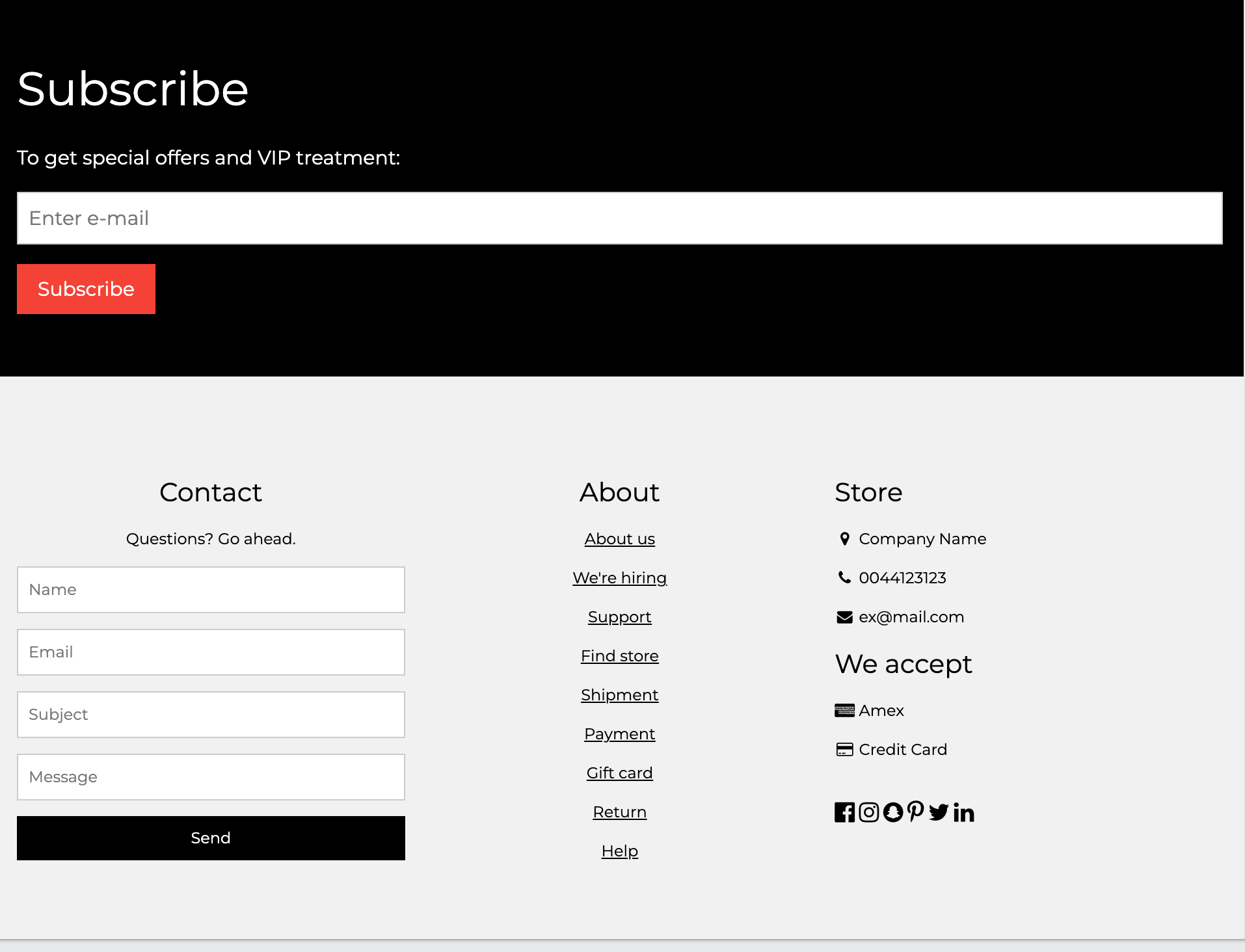 As for the rest of the website, I deleted the Newsletter and subscription options as they were not needed for the small boutique website. I wanted to create a website solely for online shopping. I also changed a few of the details on the bottom footer to match the brand, including adding the company’s name.